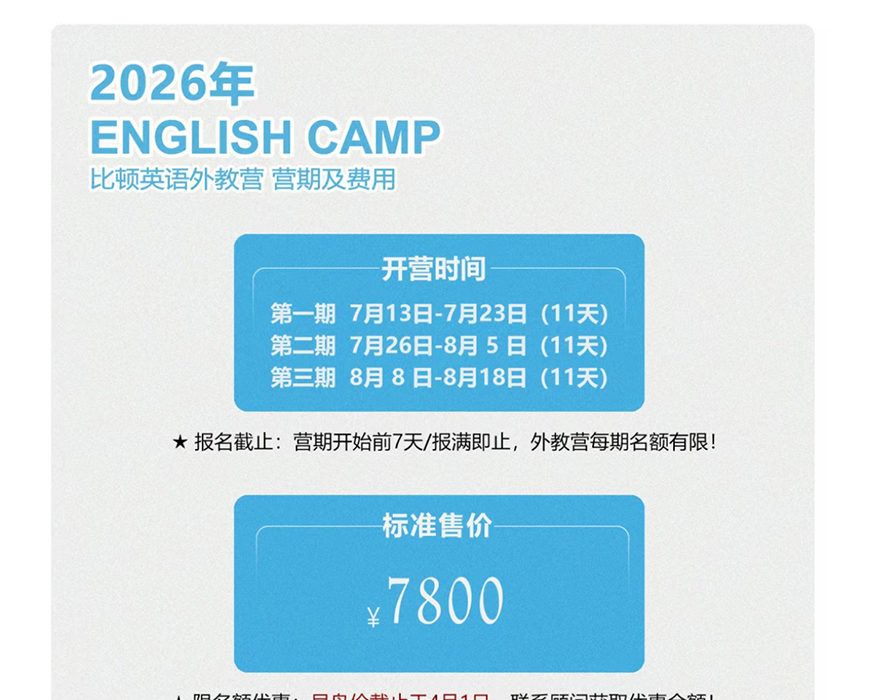 比顿2026暑假报名开启 | 国内纯外教英语夏令营解锁英语实用技能&美式活动,一营全体验!
