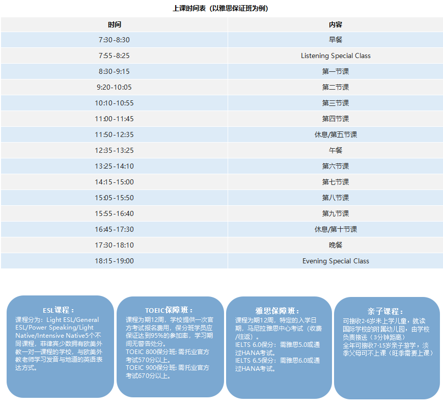2018年正式更名为Hana Academy,是菲律宾少数可以多节欧美外教一对一授课的语言学校,学校提供ESL课程,雅思保障班,托业保障班,亲子课程,3岁起幼儿园课程,有完善的设备。Hana菲律宾讲师教授阅读、语法、词汇等部分,欧美外教至少有5年授课经验,负责英美文化、常用表达、语法矫正等授课。