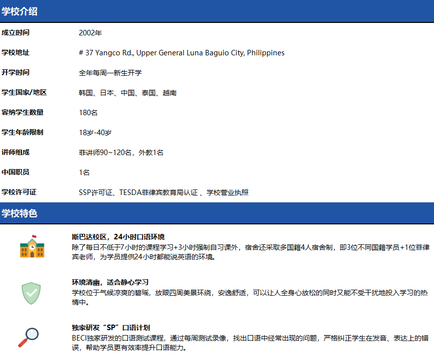 学校成立于2002年,位于菲律宾避暑胜地碧瑶,BECI配备3个独特而专业的校区,每个校区功能区分明显,能满足不同学生的日常需求。斯巴达校区提供ESL、雅思、托业等多种课程;女子校区是专为女生设置的风景优美,治愈系校园;城市校区是为上班族设计的校园,灵活的安排上课时间,工作和英语学习两不误。