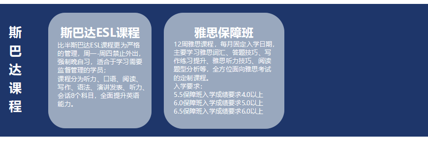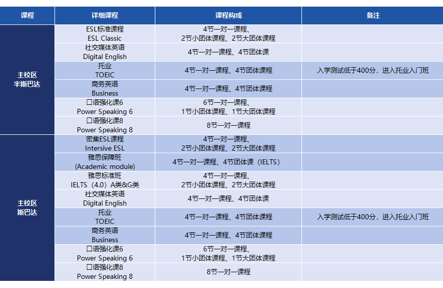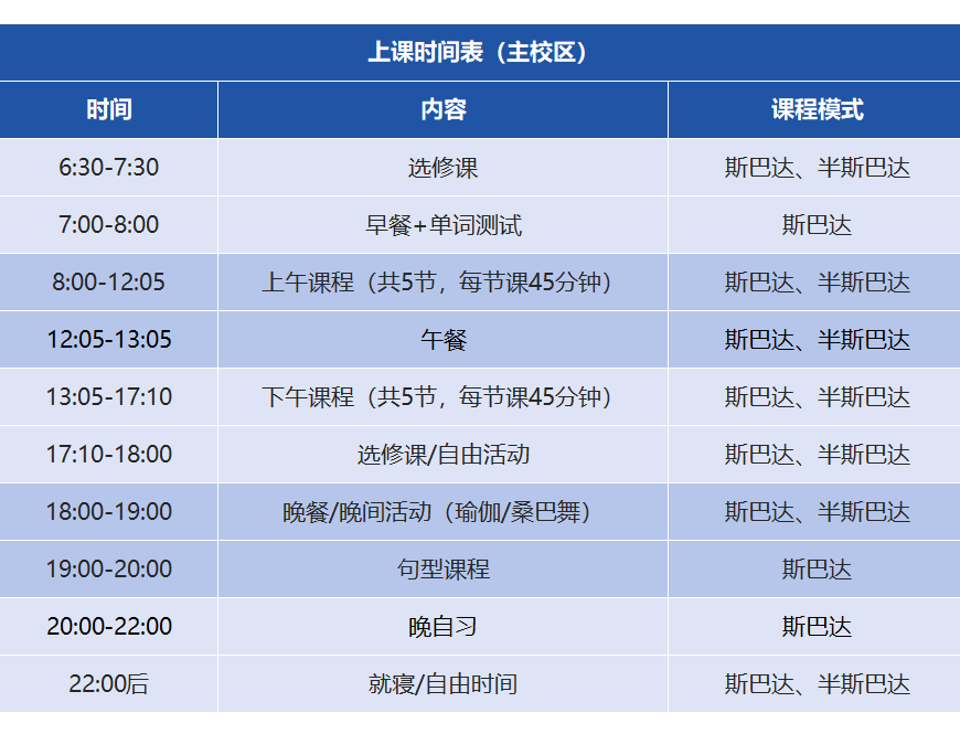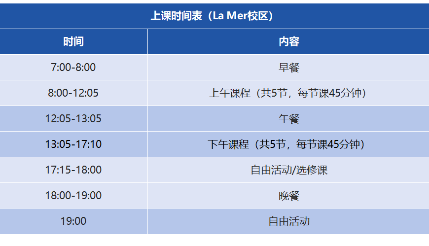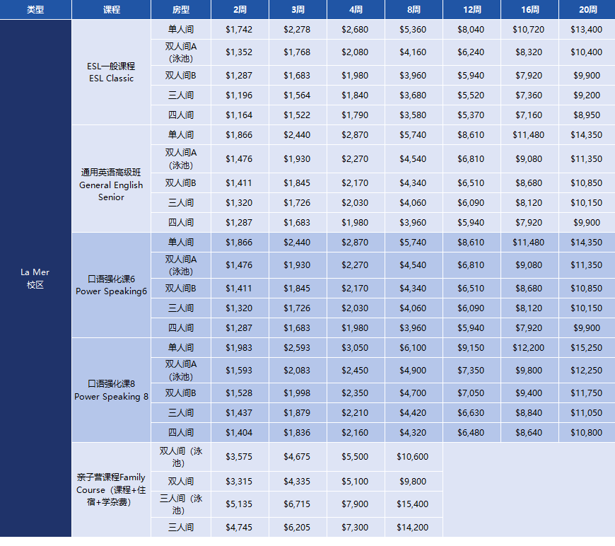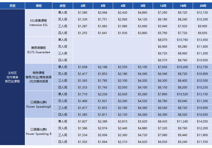 ●宿舍配置:空调、冰箱、卫浴、衣柜、书桌、床头柜、保险箱、吹风机、洗衣服务和房间打扫。学员可根据自己的预算和需求进行选择。