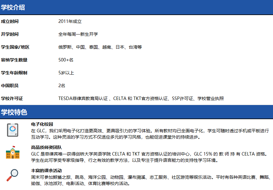 GLC 成立于2011年,是菲律宾最大的语言学校之一,位于宿务市中心,交通便利,各种生活设施一应俱全,是学生理想的学习地点。学校最初是以招收日本学生为主的英语学习中心,但现在已经接待了来自亚洲、欧洲和南美洲的 10,000 多名学生,他们来自世界各地20个国家和地区,营造出多元化国际环境。GLC将致力于提供各种现代化设施,个性化服务支持,以及温馨且包容的学习环境,真心欢迎每一位学生。