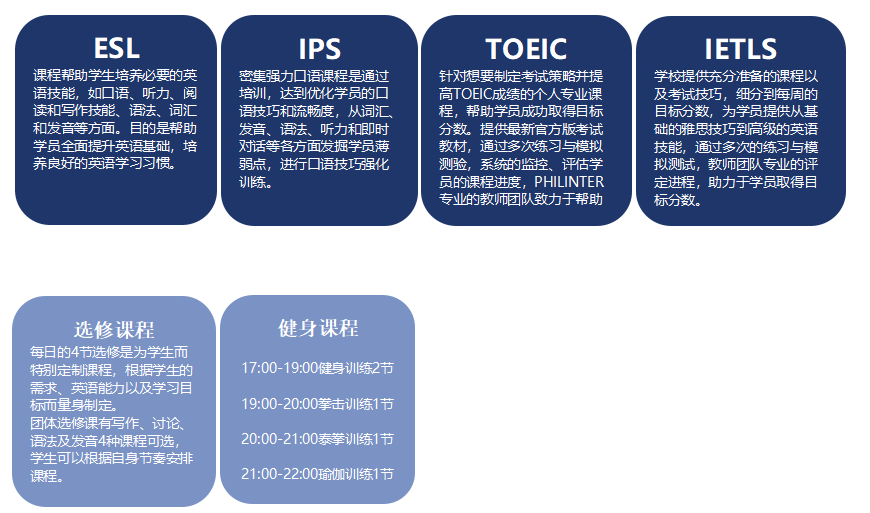 Philinter是由英籍教授院长管理的高品质语言学校,已有20年的办学经验,学校一直采沿用国际化的管理方式,采用国际认可的CEFR英语分级。09年搬到位于马克坦的岛新校区,设施更加完善,步行范围内有7-11,购物商场,餐厅等生活设施,距离机场十分钟车程,交通便利,学校开发“国籍配额制度”的入学系统,通过合理的国际分配,来为学员提供国际化的语言交流环境。