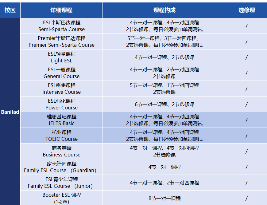 CG是拥有两大校区的大型语言学校,以强大师资、专业的教师培训和完善的教师管理系统著称,可根据学生需求,定制丰富多元的课程,选择合适的校区研习。 ▼Sparta校区,宿务最强的斯巴达学校之一,度假村风格学校。 ▼Banilad校区,位于宿务市中心的舒适花园式校区。