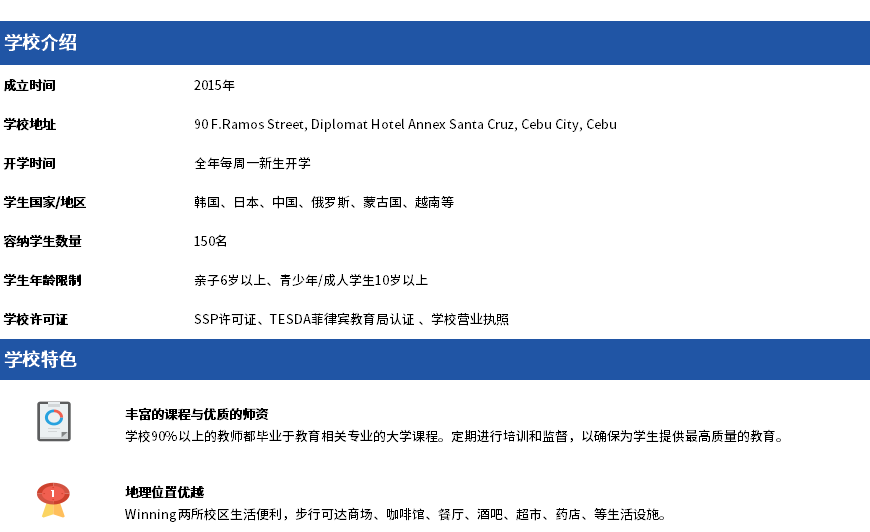 Winning国际语言学校(Winning English Academy),两个校区,于 2015 年成立,City Campus校区位于宿雾市中心,步行5分钟可达生活商圈、购物中心。Ocean Campus校区位于马克坦岛,是一个著名的度假胜地,步行3分钟内即有超市、和餐厅等生活设施。